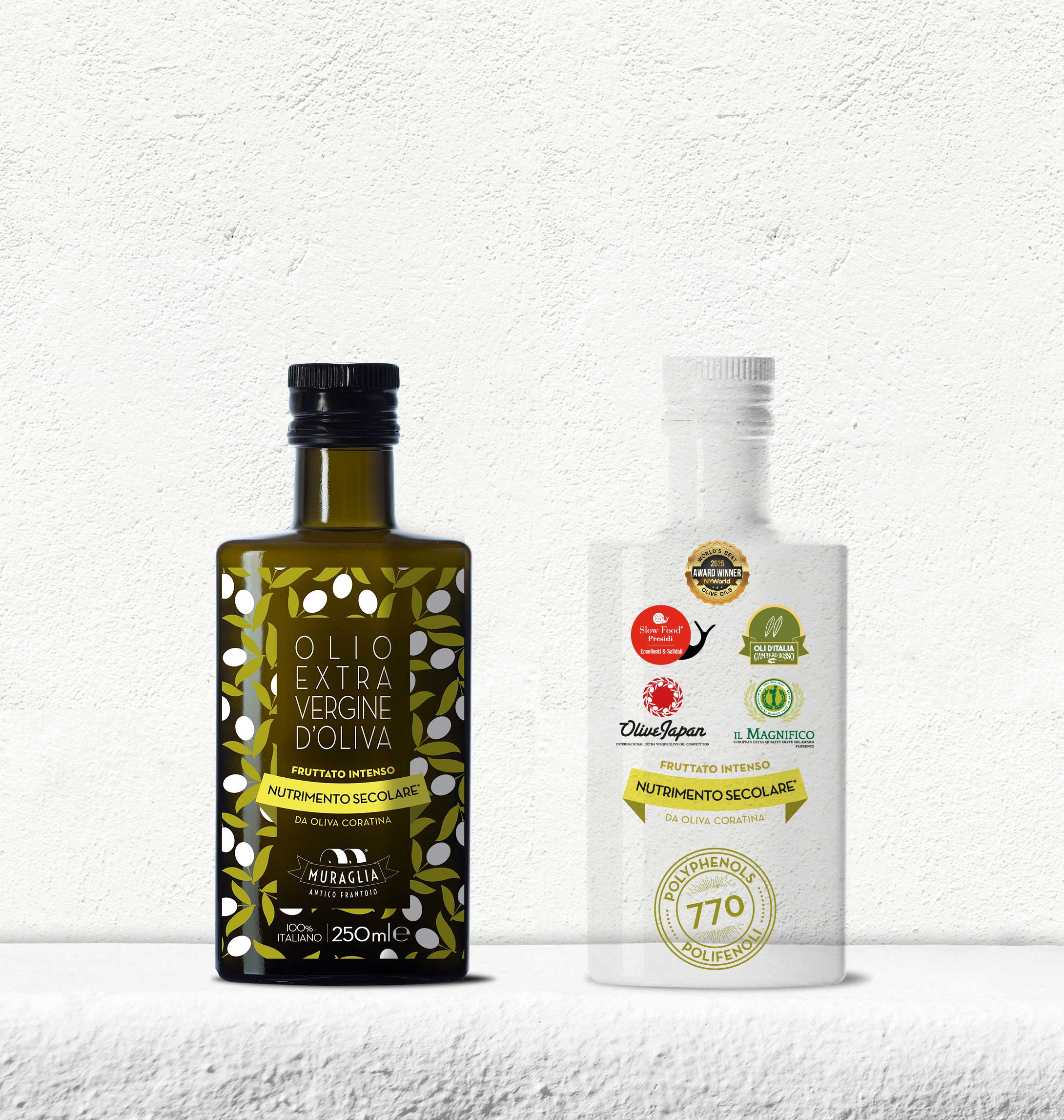 L’huile d’olive extra vierge Fruitée Intense est obtenue à partir de l’olive monovariétale Coratina. Puissante et vraie. Vert intense avec des reflets dorés. Arômes d’aneth, de fenouil, d’artichaut, de poivre et de foin. Elle laisse un goût savoureux et épicé.